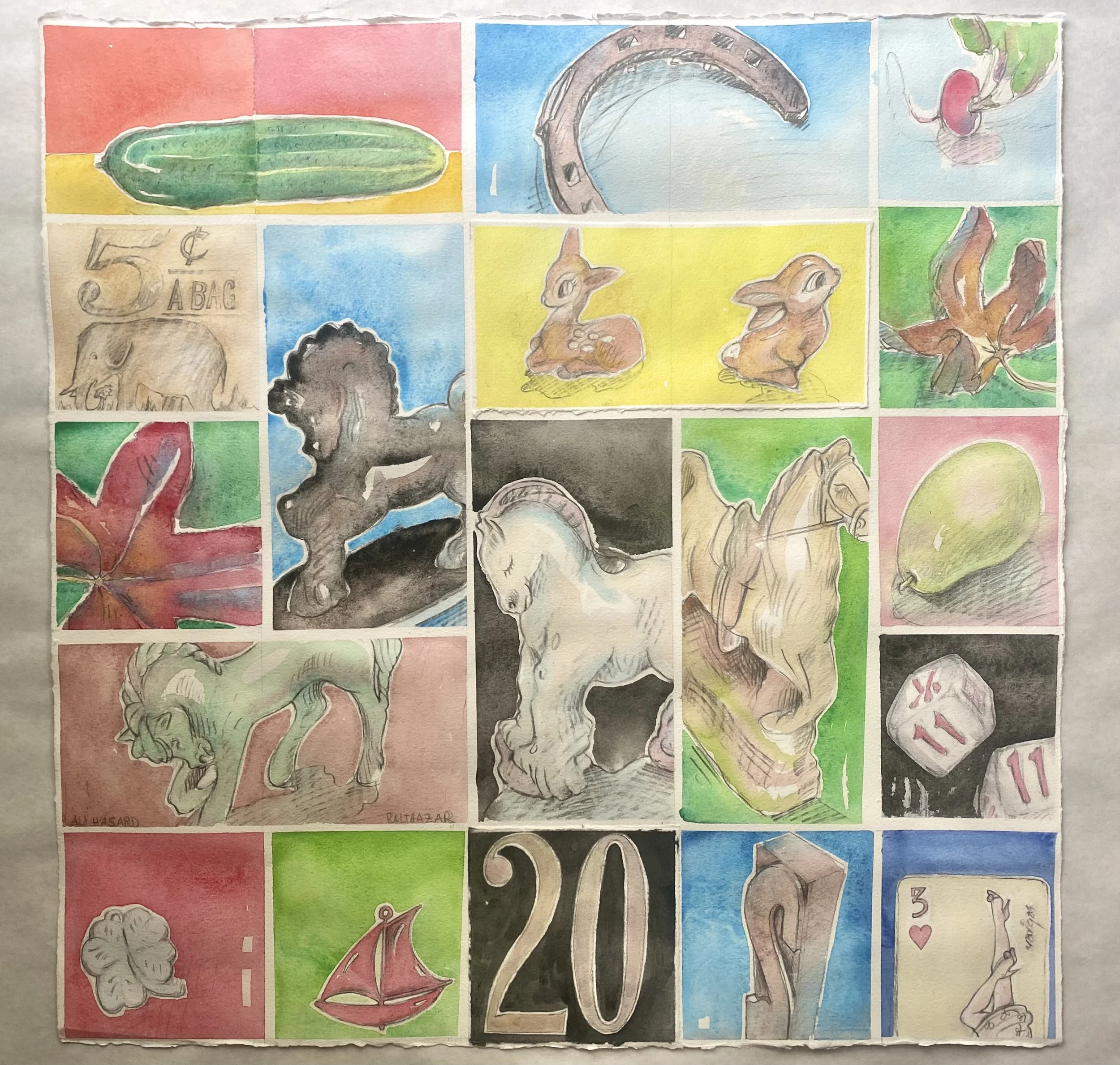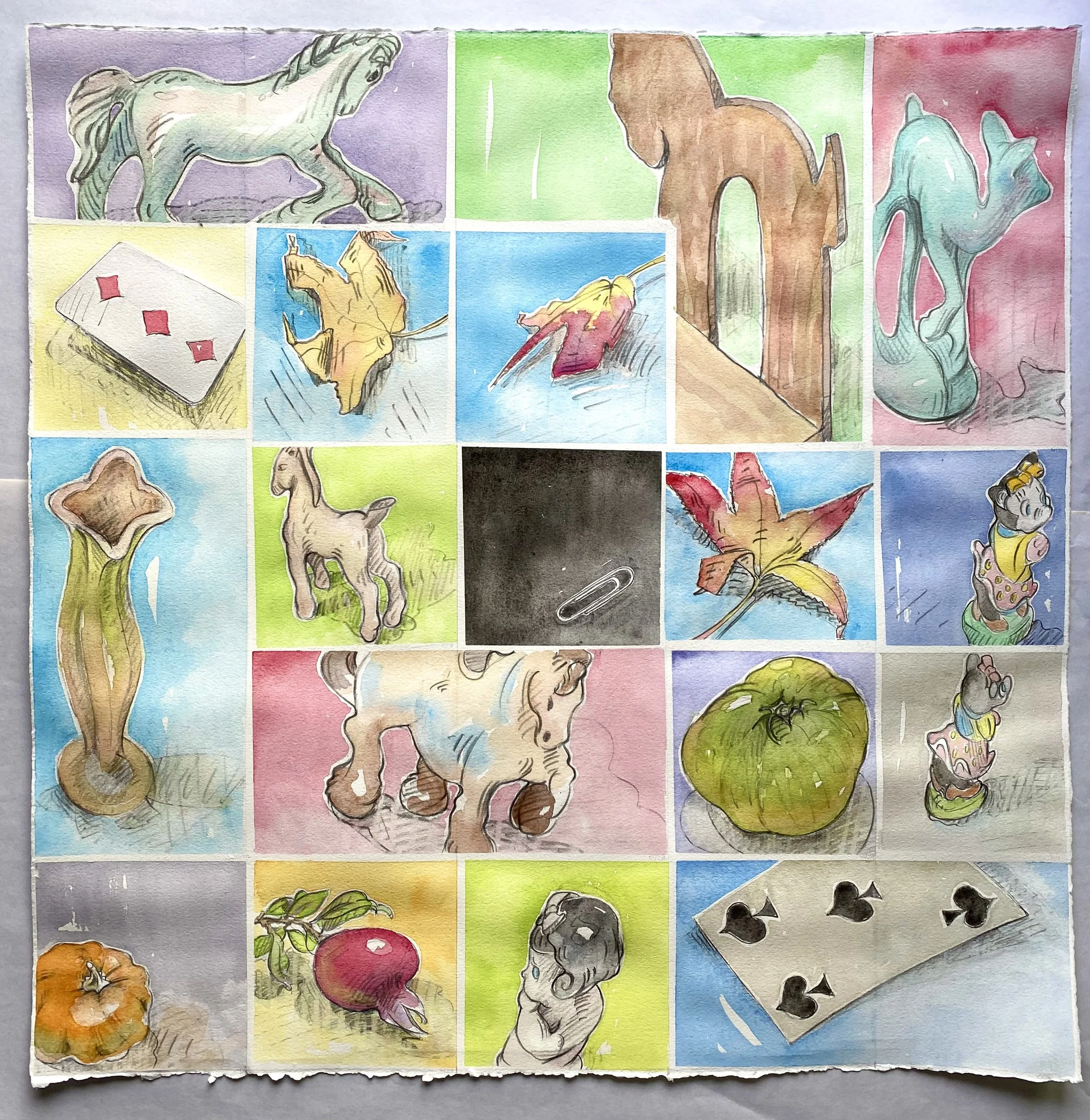 ALL PANELS ARE WATERCOLOR AND GRAPHITE ON PAPER, DIMENSIONS 22”x 22”
