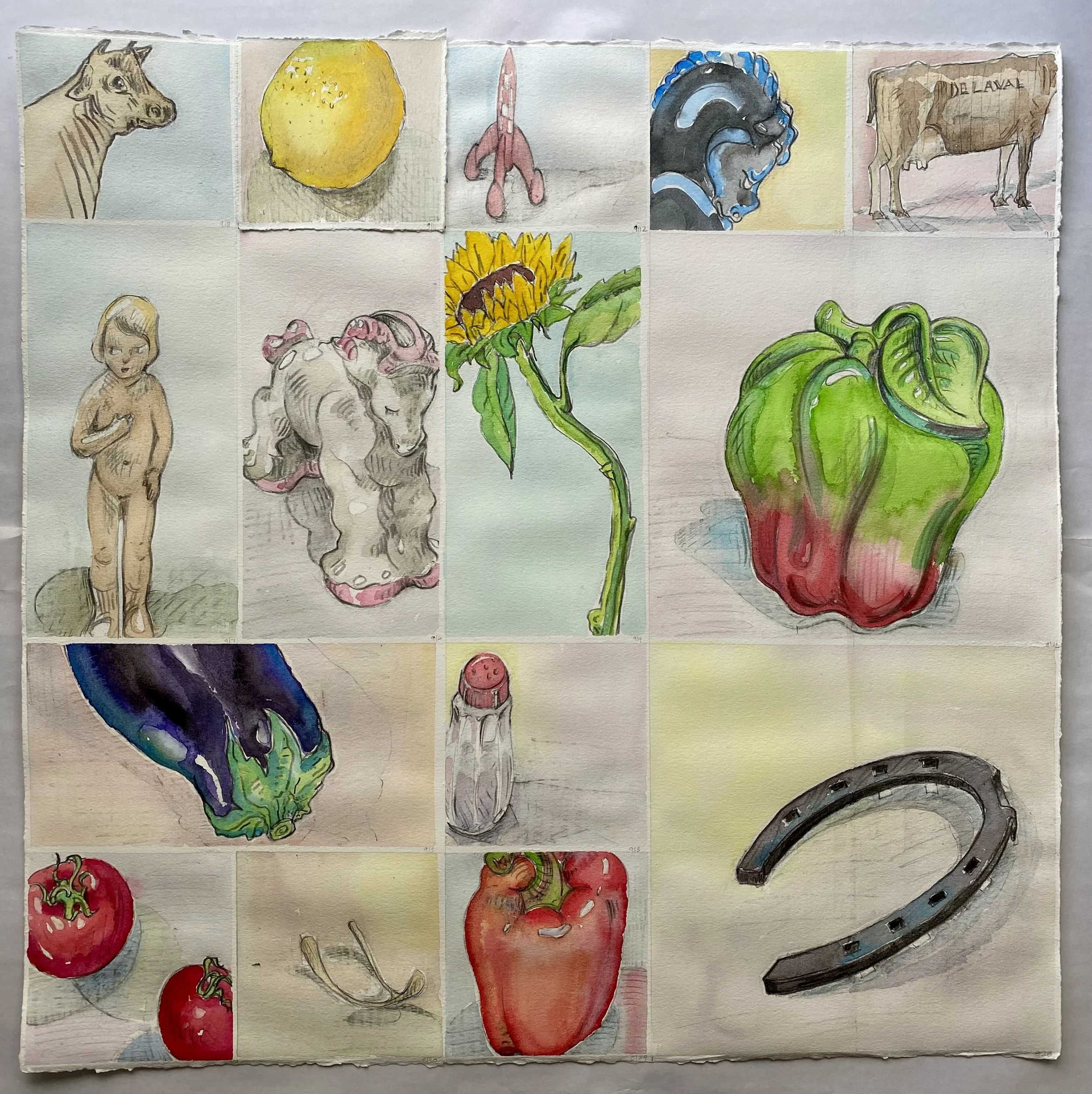 I grid my 22”x22” paper. Each object within a square or rectangle of the grid is one of my daily drawings. Each sheet includes at least 21 individual daily drawings, and takes at least three weeks to complete. So far there are 101 completed sheets.