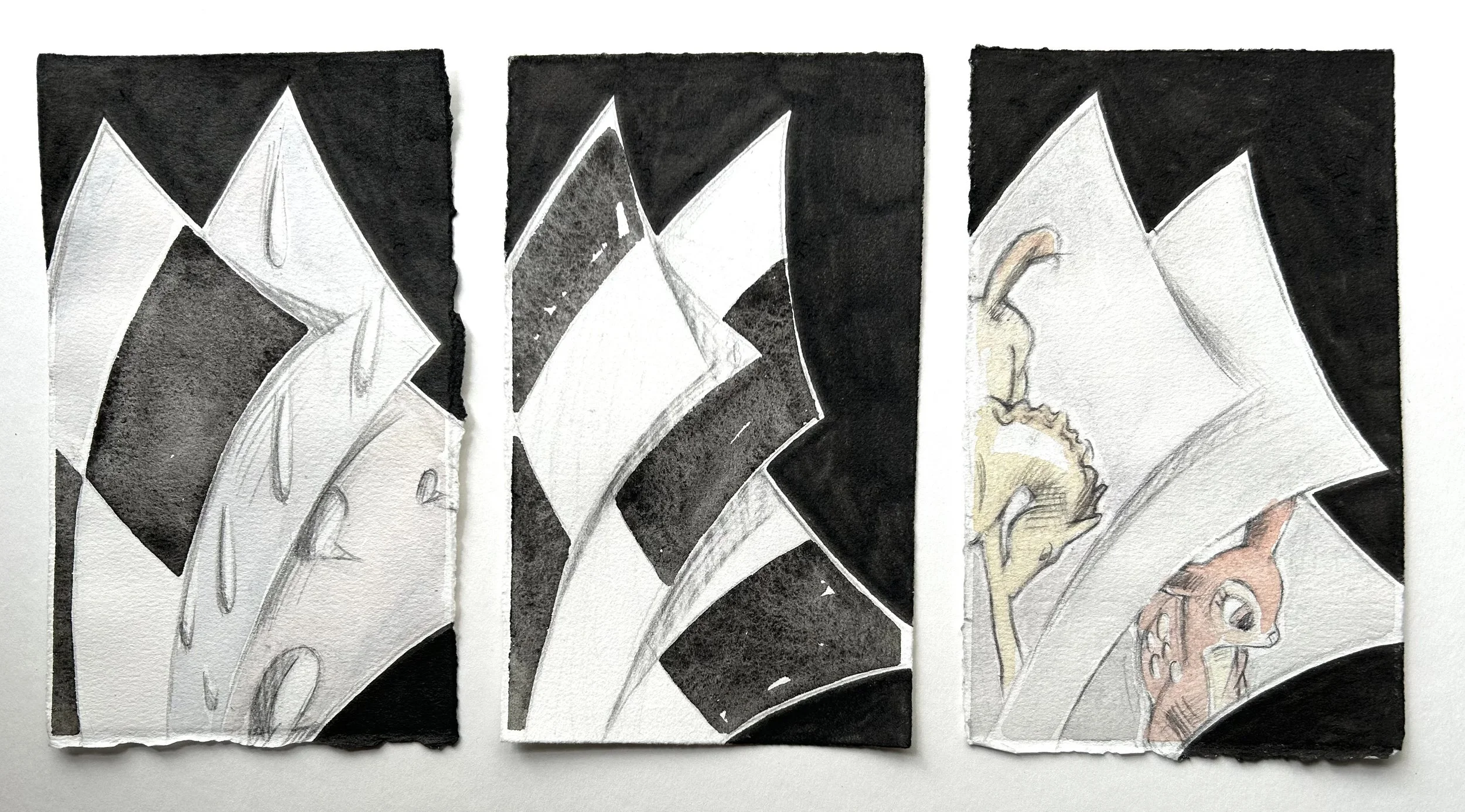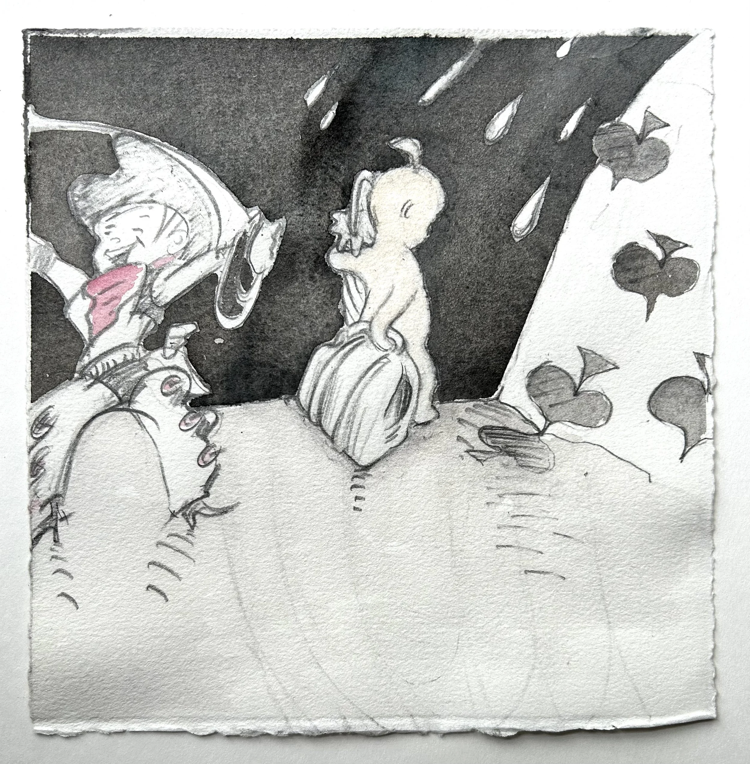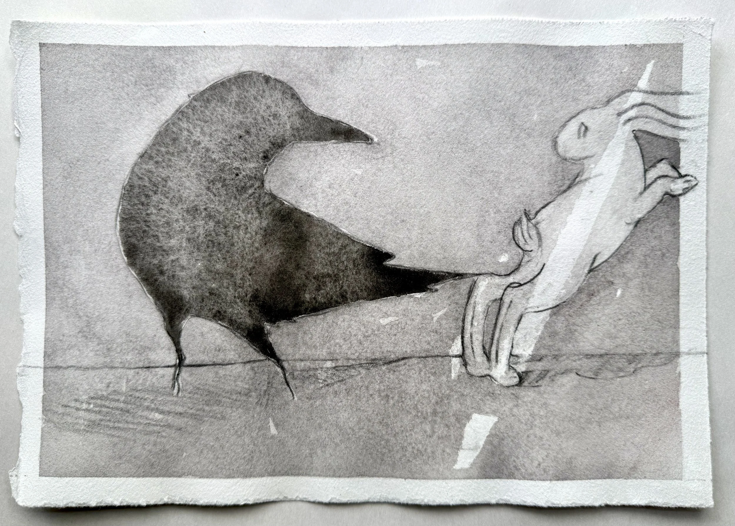 Crow and Rabbit, 2025, 8"x11", graphite, watercolor, paper
